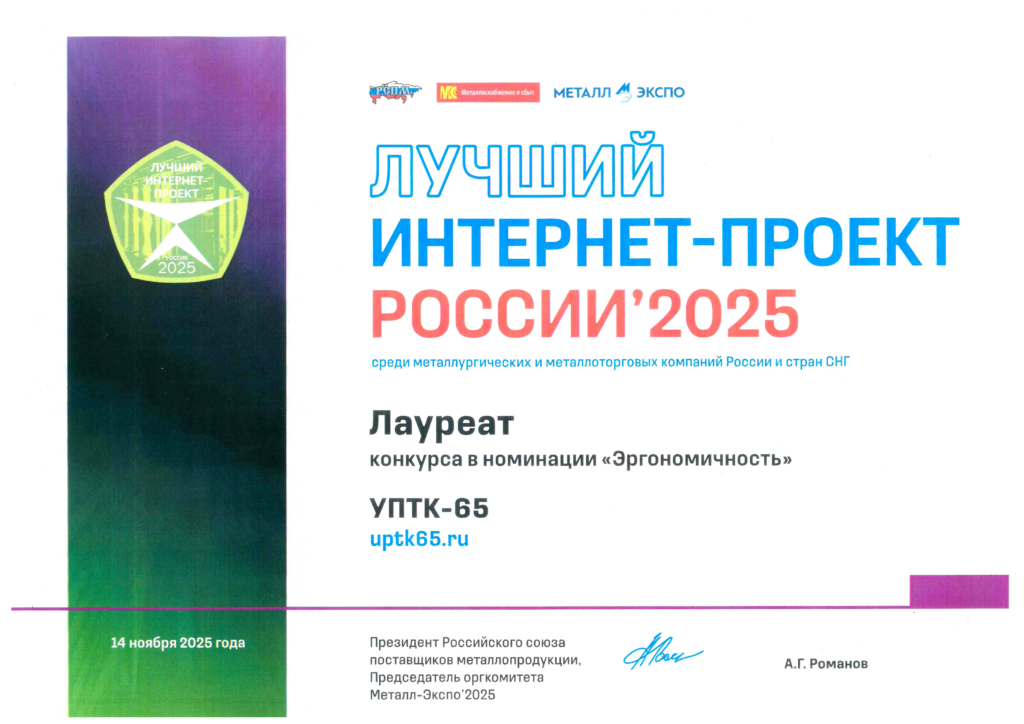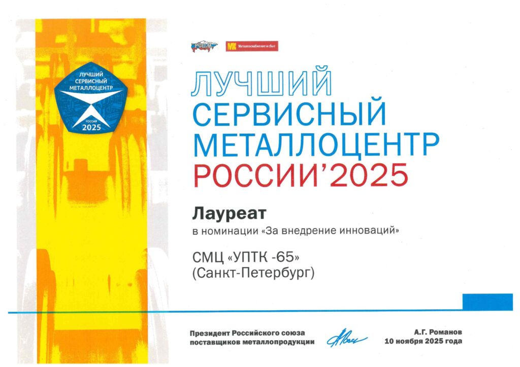 — Награда в номинации «За внедрение инноваций» в конкурсе «Лучший Сервисный Металлоцентр России’ 2025». Эта премия свидетельствует о признании высокого уровня технического оснащения предприятия, внедрения прогрессивных методик и постоянных усилий команды УПТК- 65 по улучшению качества продукции и оптимизации производственных процессов.